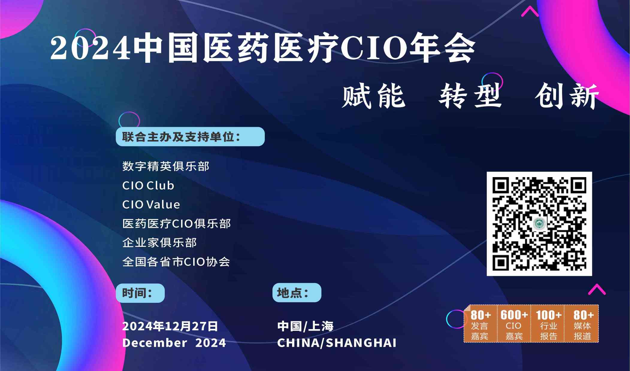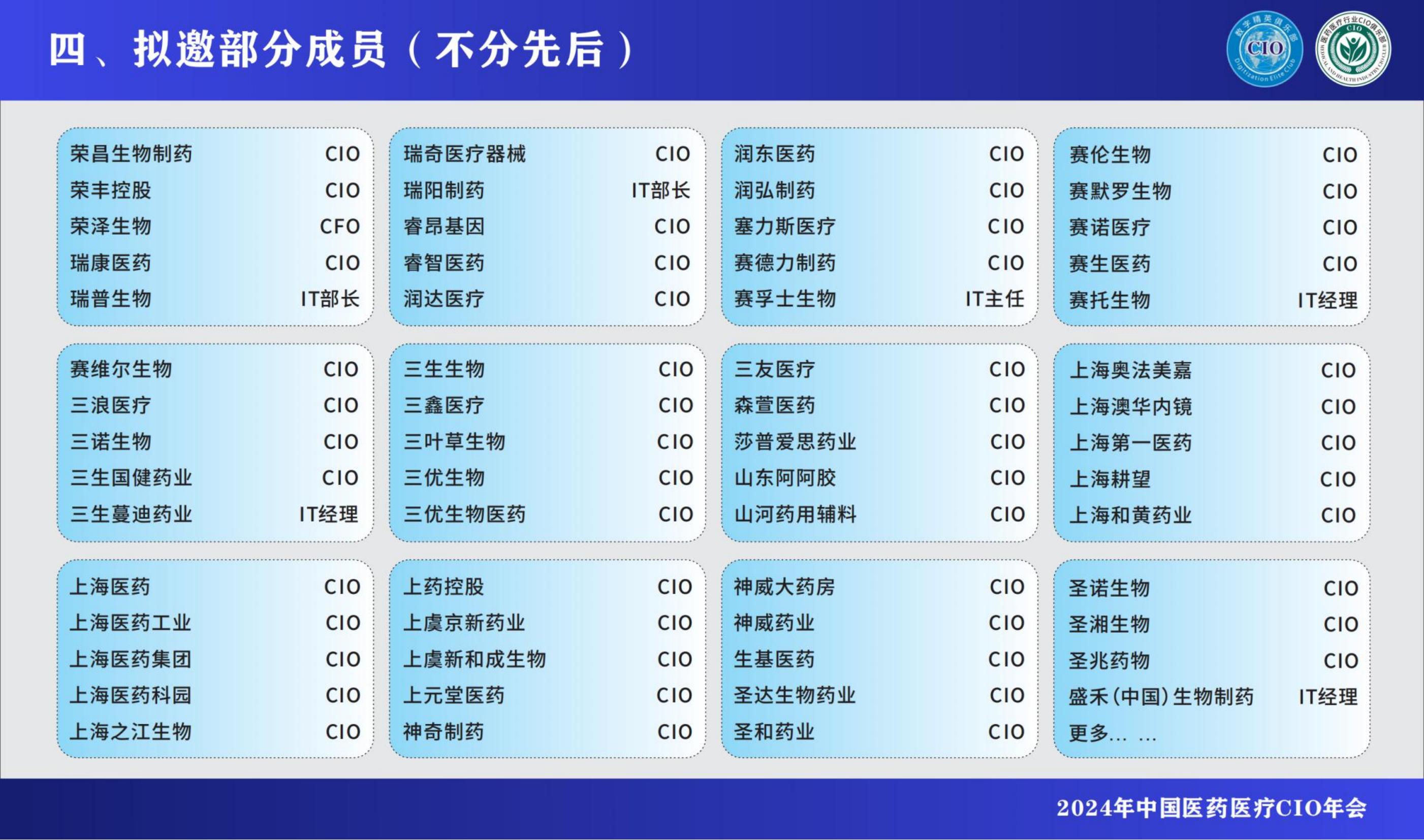 2024中国医药医疗CIO年会暨中国首届医药医疗AI大会,将于2024年12月将在上海召开,本次峰会由数字精英俱乐部、医药医疗行业CIO俱乐部、CIOClub、CIOvalue、全国部分省市CIO协会、企业家俱乐部等多个知名组织联合主办及协办,以“赋能 转型 创新"为主题,将邀请600+CIO嘉宾,来自医药、医疗器械、药业、医疗等行业的CI0、CTO等信息化相关负责人及行业知名信息化服务商。