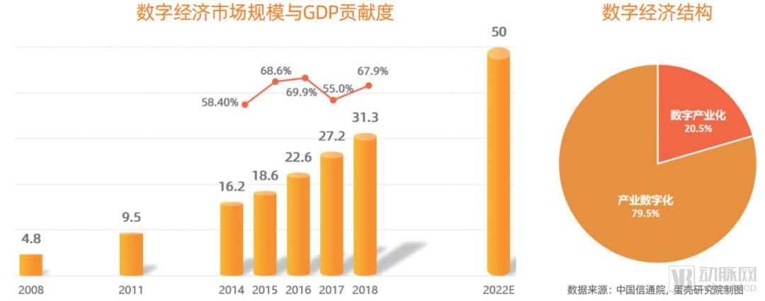 最新的研究显示,2018年,我国数字经济规模达到31.3万亿元,同期中国GDP达到91.9万亿元,占GDP比重的34.8%。将数字经济规模按可比口径计算,数字经济实现名义增长20.9%,占比提升1.9%,预计2022年数字经济规模能达到50万亿元。