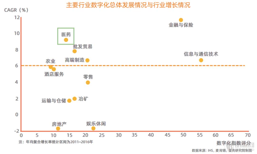 蛋壳研究院通过公开资料及相关研究报告对目前主要行业的数字化总体发展情况与行业增长情况进行了梳理,梳理后,我们发现:医药行业保持较高的行业增长率,市场增长率约10%,但是整体的数字化程度相对较低,整体评分不到15分,长期高速增长及现阶段低数字化对于医药行业数字化是一个机遇也是挑战。