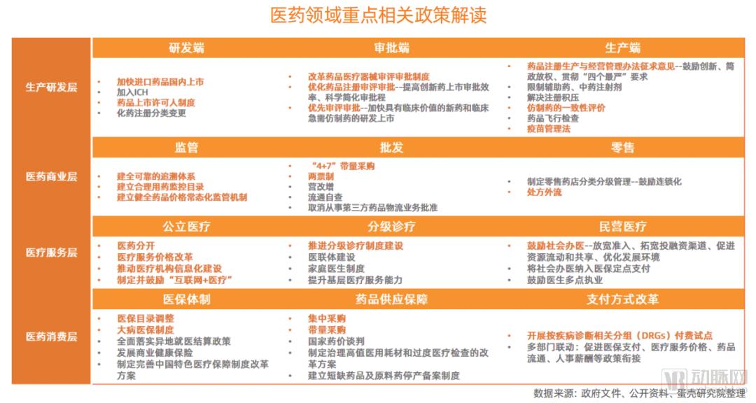 医药消费层:从医保体制层面保障患者用药的刚性需求、从药品供应及支付两个方面降低医保报销成本,减低医保支付压力。