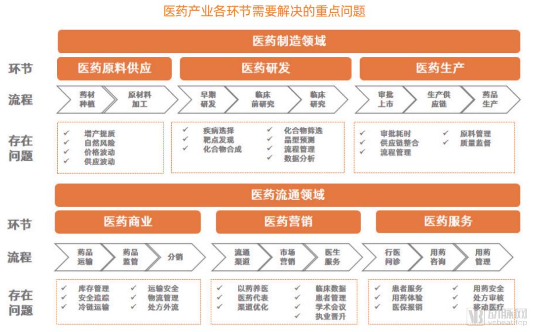 医药制造领域:指药品从原材料到最后药品的成型,是一个从“0”到“1”过程,涉及医药原料供应、医药研发及最后的医药生产三大环节。