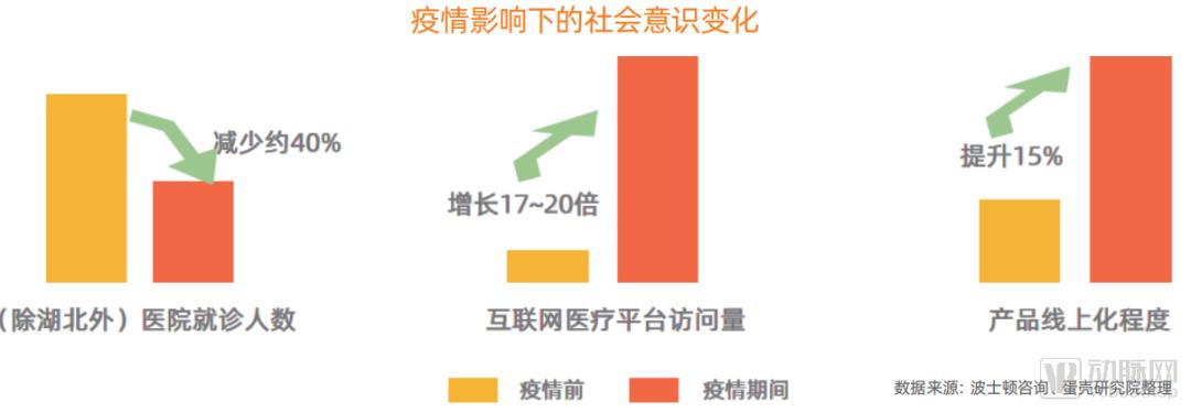 中国的传统就医习惯是直接去线下医疗机构就诊,但是在疫情下,尤其是湖北地区线下医院成为高风险区域。在疫情期间,许多医院投入大量资源和医疗能力收治新冠患者并暂停或暂缓了部分常规诊疗服务;同时,普通病人为避免风险也选择少去或尽量不去医院。这将许多无法出门或不愿意在疫情期间去医院就医的患者推向了线上就医。国家卫健委的数据显示,今年2月,全国(除湖北外)医院就诊人数减少约40%。