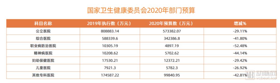 财务司的数据显示,2020年,国家卫生健康委员会部门预算大幅下降,各类医院预算降幅在26%~53%之间,其中公立医院预算下降29.11%,综合医院预算下降41.80%。